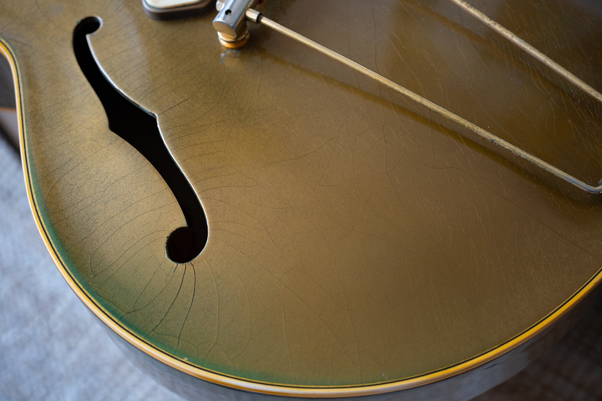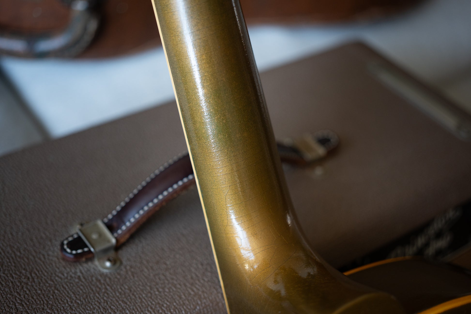 The gold finish has aged beautifully over the past 70 years, developing in places the characteristic greenish hue caused by the use of bronze powder in the lacquer. The finish is entirely original throughout, with no overspray. There is a small area finish above the tone knob that flaked off.